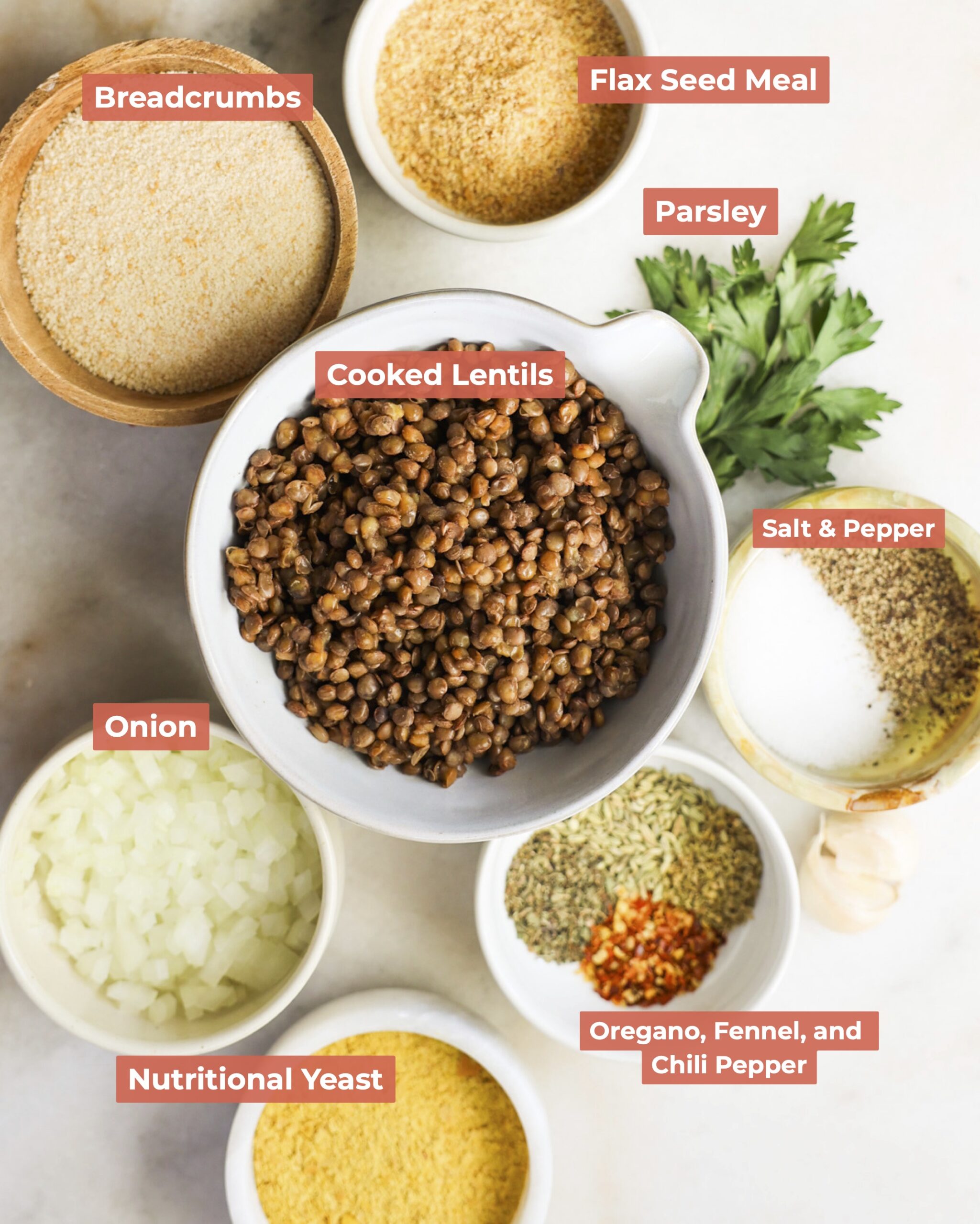 - Prepare Meatball Base. Combine the cooked lentils, garlic, onion, nutritional yeast, fennel seed, parsley, thyme, salt, black pepper, chili flakes, breadcrumbs, and flax egg in a large mixing bowl. Stir well to combine.