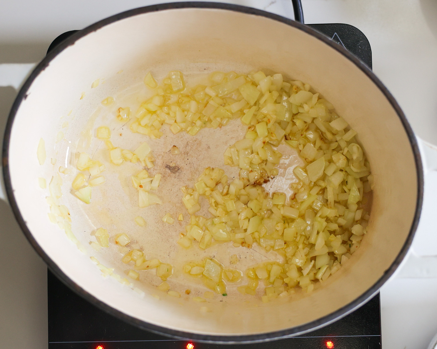 - Sauté aromatics. Heat the olive oil in a large, heavy-bottomed pot over medium heat. Add the minced garlic and onion and sauté for 3-5 minutes until the onions turn translucent.
