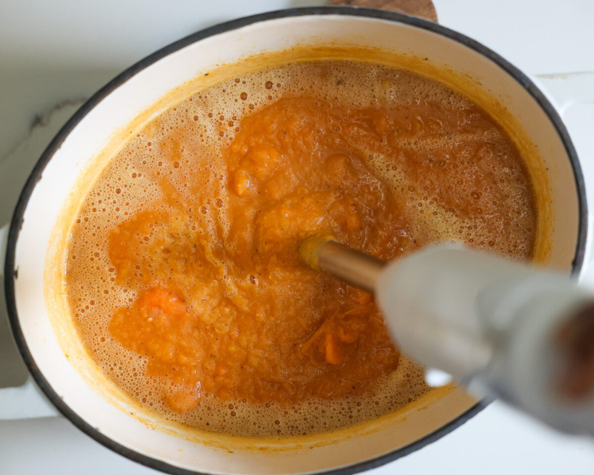 Immersion blender or high speed blender. For the silkiest texture, use a high speed blender to blend the soup. Before blending, let the soup cool until safe to transfer to the blender. Blend until smooth, but remove the center cap from the blender’s lid and cover with a kitchen towel to allow steam to escape as it blends. I love using an immersion blender to avoid dirtying more dishes, but it will require a longer blending time.