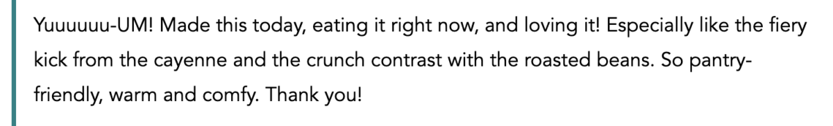 Yuuuuuu-UM! Made this today, eating it right now, and loving it! Especially like the fiery kick from the cayenne and the crunch contrast with the roasted beans. So pantry-friendly, warm and comfy. Thank you!