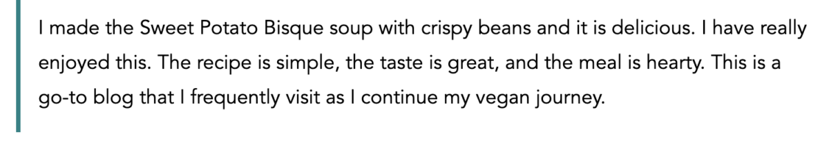 I made the Sweet Potato Bisque soup with crispy beans and it is delicious. I have really enjoyed this. The recipe is simple, the taste is great, and the meal is hearty. This is a go-to blog that I frequently visit as I continue my vegan journey.